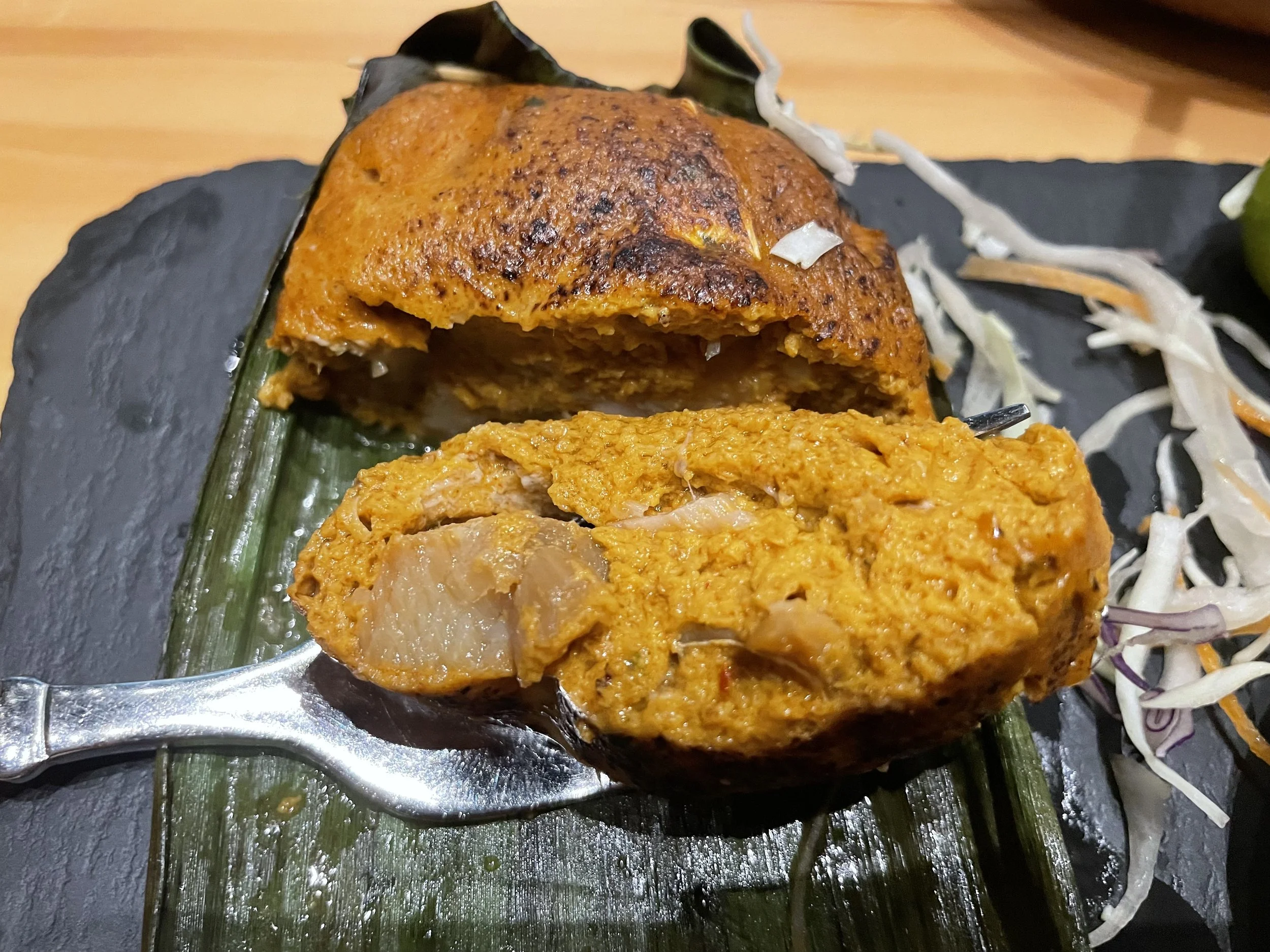 Smoked cod otah: grilled spicy fish paste with chunks of smoked cod, otah is a delicious local dish loved throughout South East Asia.