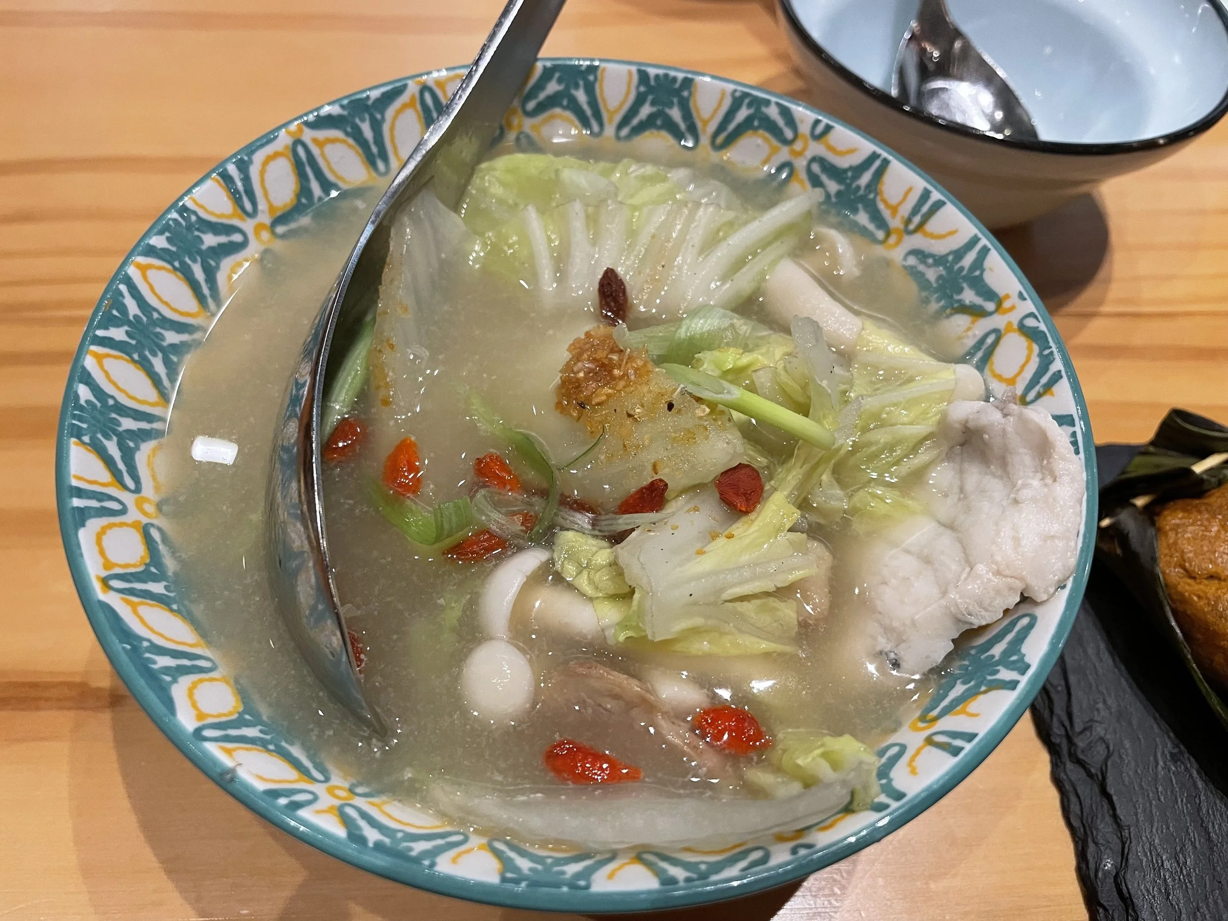 XO white fish soup: white, collagen-rich fish soup that is accomplished through 6-8 hours of preparation, with no milk added. Served with fresh cabbage and yam.