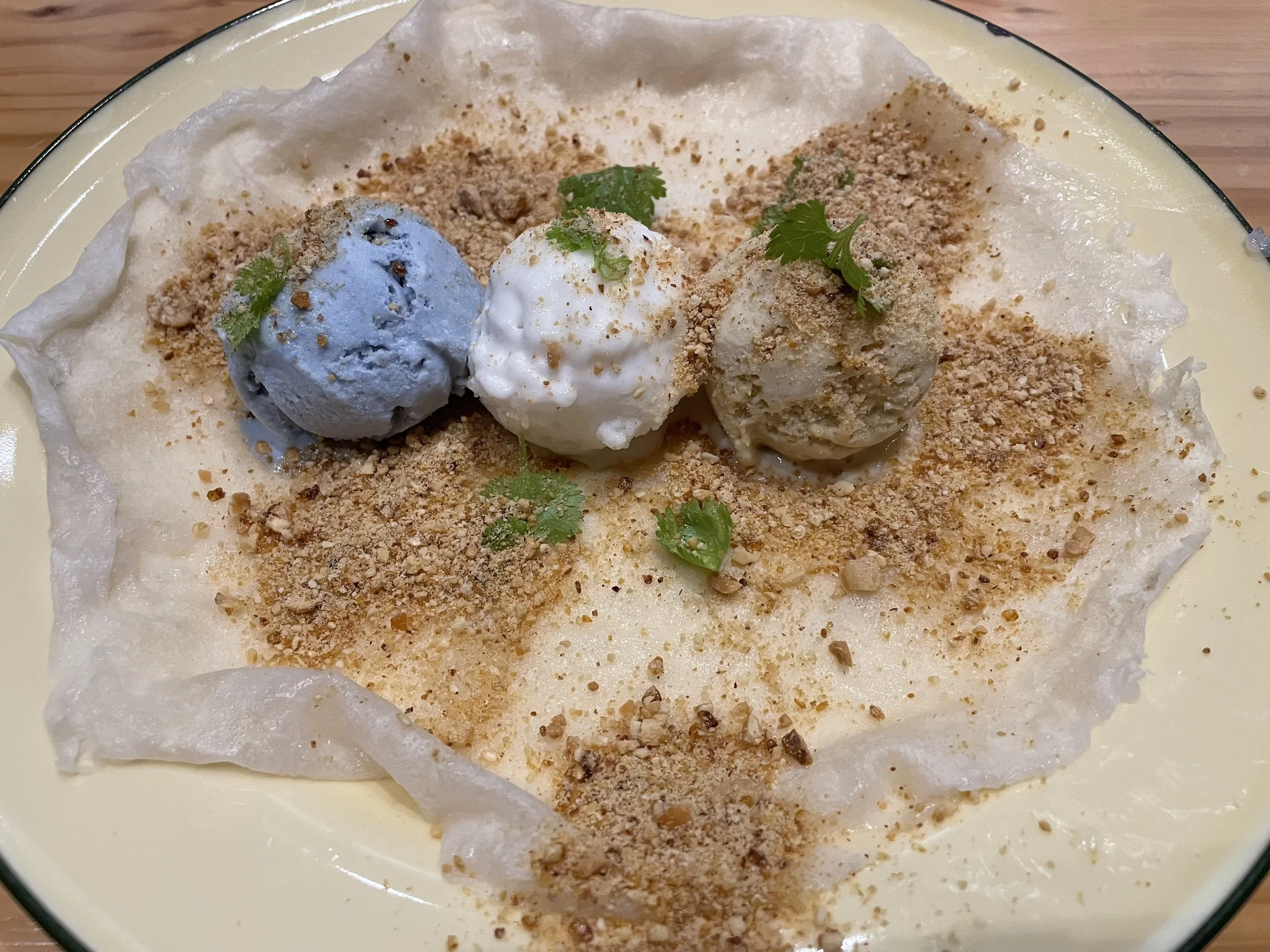 Popiah garden: three scoops of gelato: blue pea pandan lemongrass, sea salt Horlicks and soursop – on a popiah skin “lawn” with shaved peanut candy “soil” and coriander “shrubs”.