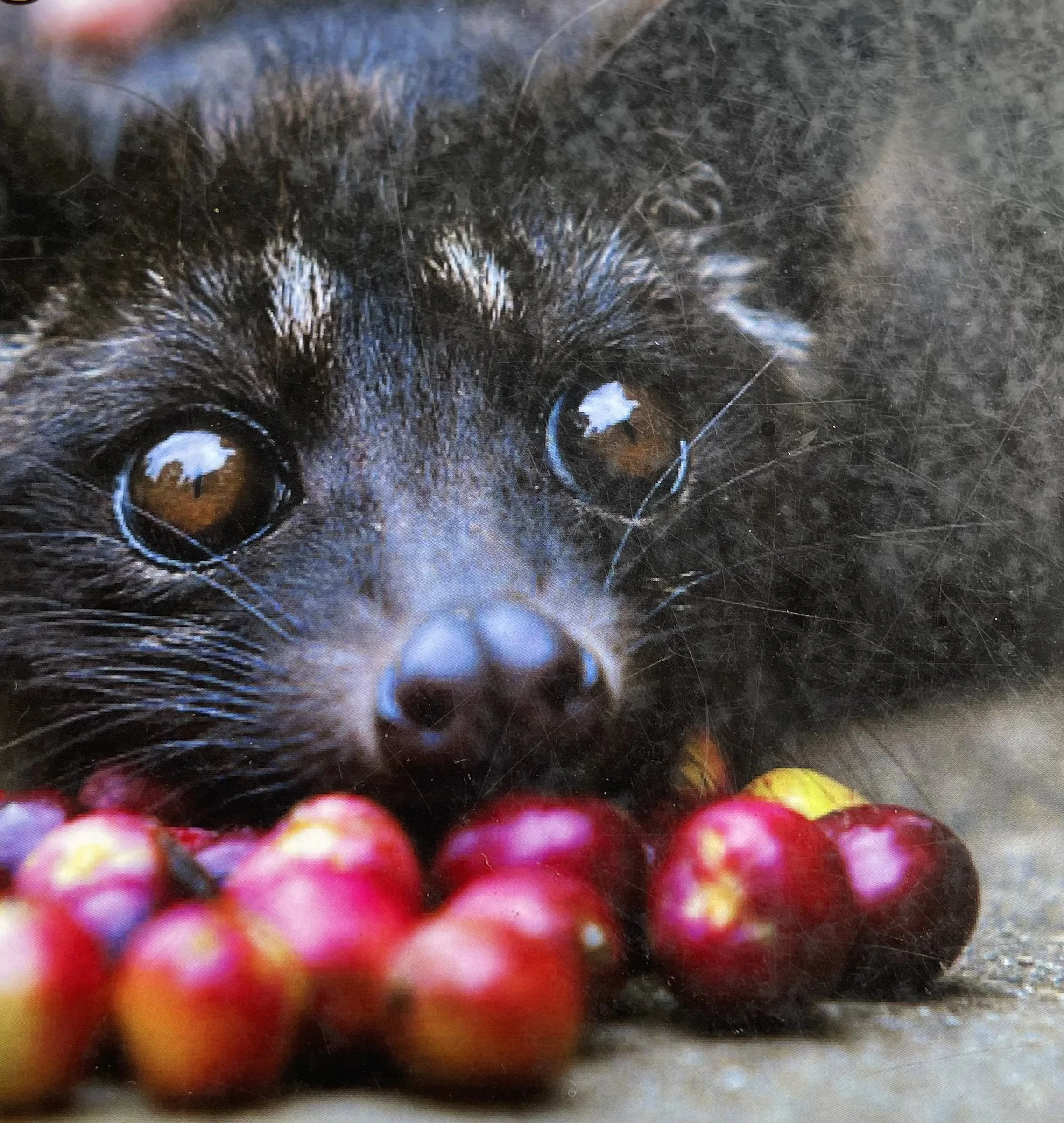 Civet (here called luwak), a cute nocturnal animal, lives in the trees and eats red coffee cherry. In its stomach, coffee beans undergo a chemical treatment and fermentation, and they pass through the digestive system. The excrement contains intact beans. They are collected, thoroughly washed, peeled, washed again, dried, roasted, and brewed.