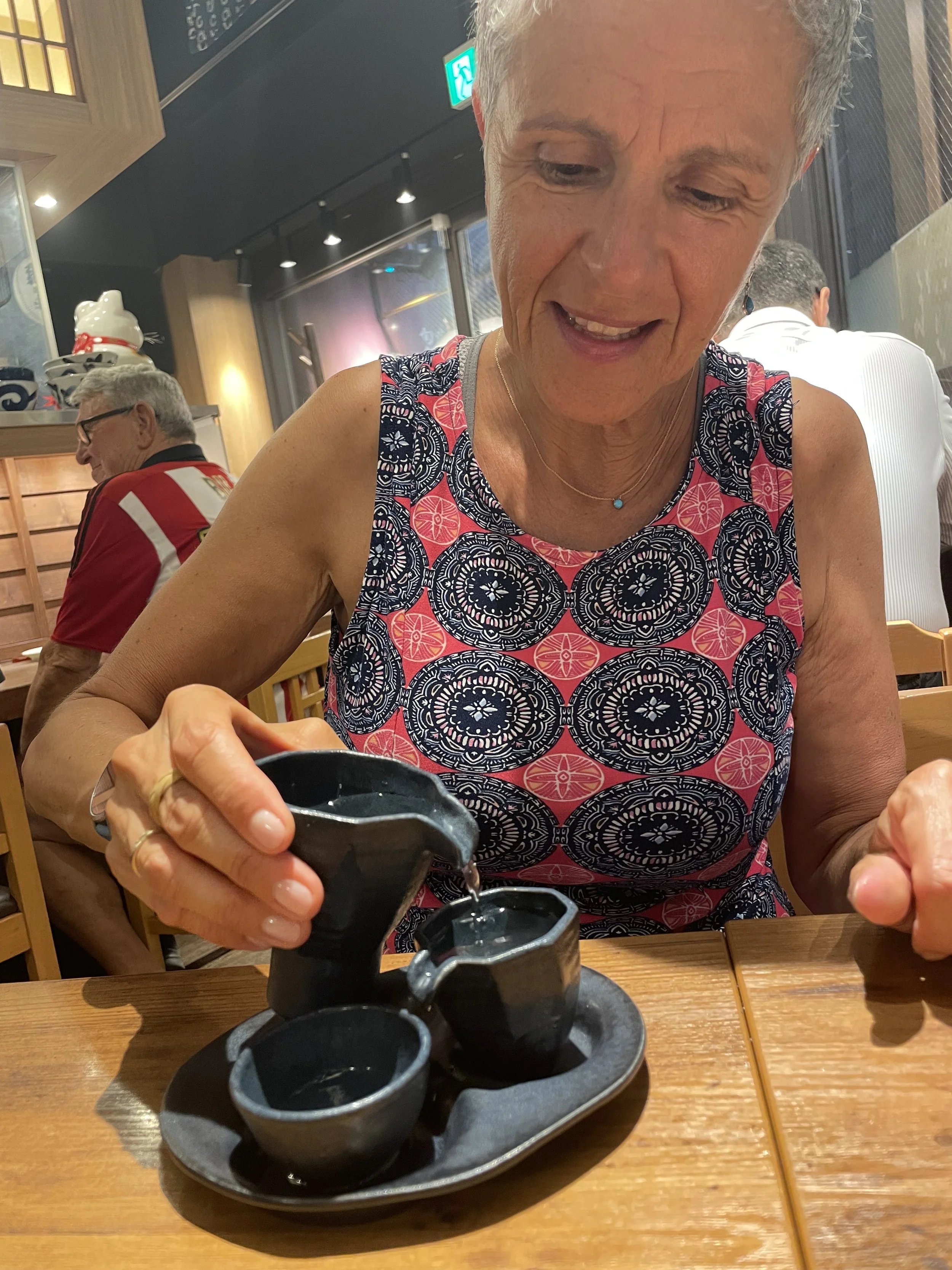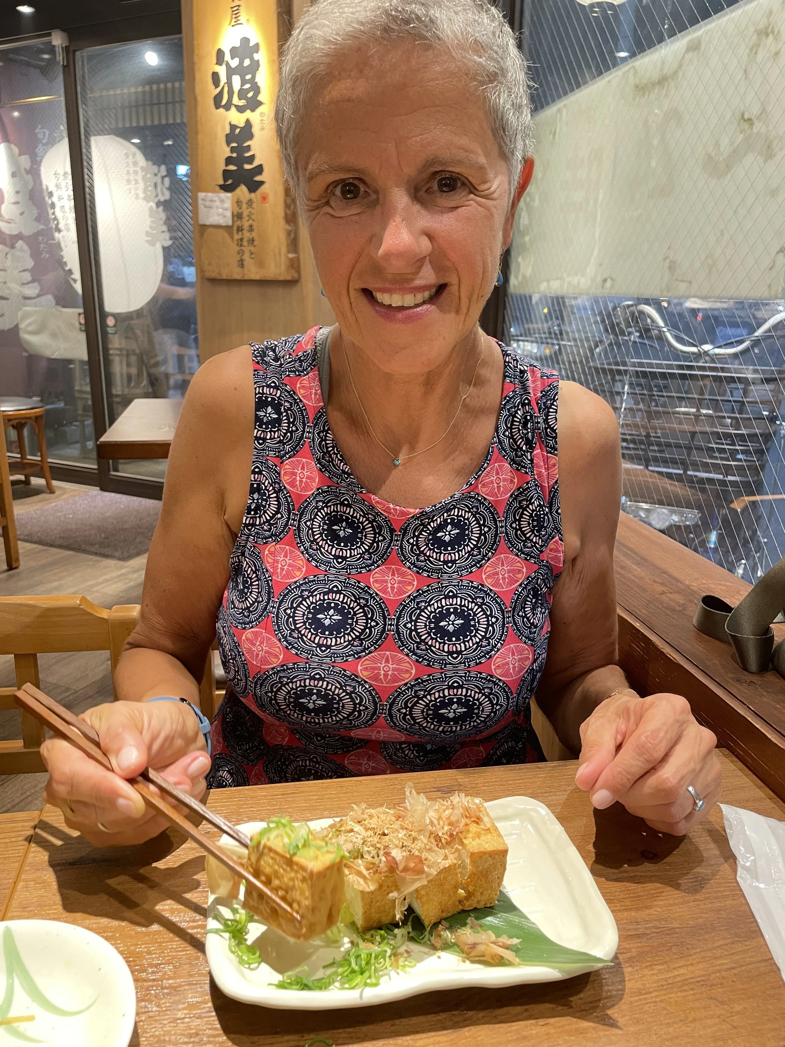 Two kinds of sake (cold) arrived first, and we could tell by the initial sips that they were high-quality beverages, smooth and flavourful (and served is generous quantities). The restaurant (I don’t know the name as it was written in Japanese only) served Japanese equivalents of tapas: small servings of freshly made delicious dishes, each clearly prepared with love and attention to detail, and we very much enjoyed every morsel and spoon of: miso soup with offal, chicken skewers (yakitori) with pickled plum, pork belly skewer, seaweed with daikon, roasted shishito peppers, agedashi tofu, red tuna sashimi, and freshly grilled mackerel. Another confirmation that little places off the beaten track are the best. The owner was sad that we weren’t staying longer in Tokyo. We promised to be back and we meant it. This meal convinced us that we wanted to do that.