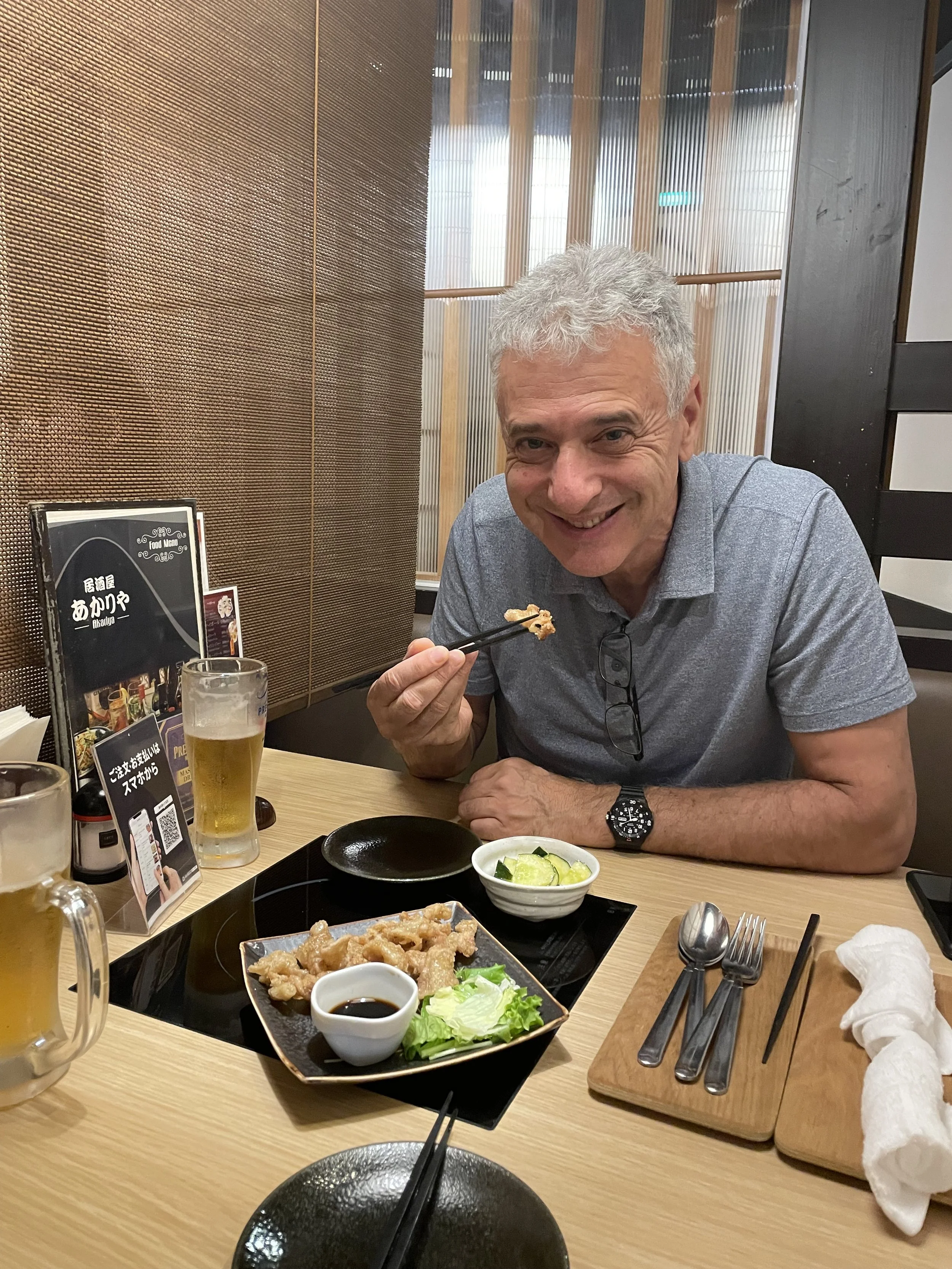 The menu was a pub fair, from fried chicken to Caesar salad, but it did have a selection of local dishes as well, and we enjoyed the pickled spicy cucumber, teppanyaki chicken (pieces sautéed and served on a hot pan), fried chicken skins, and yakitori (different meats on skewers; we particularly liked chicken hearts), rice, and a pint of beer (refreshing in the summer heat). A very pleasant experience.